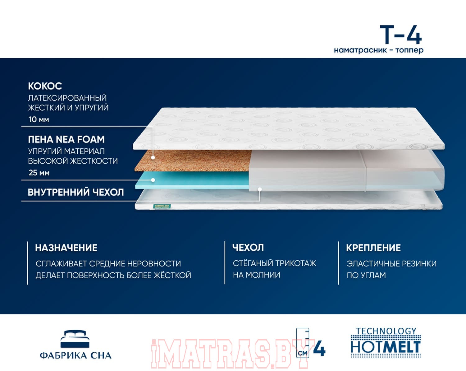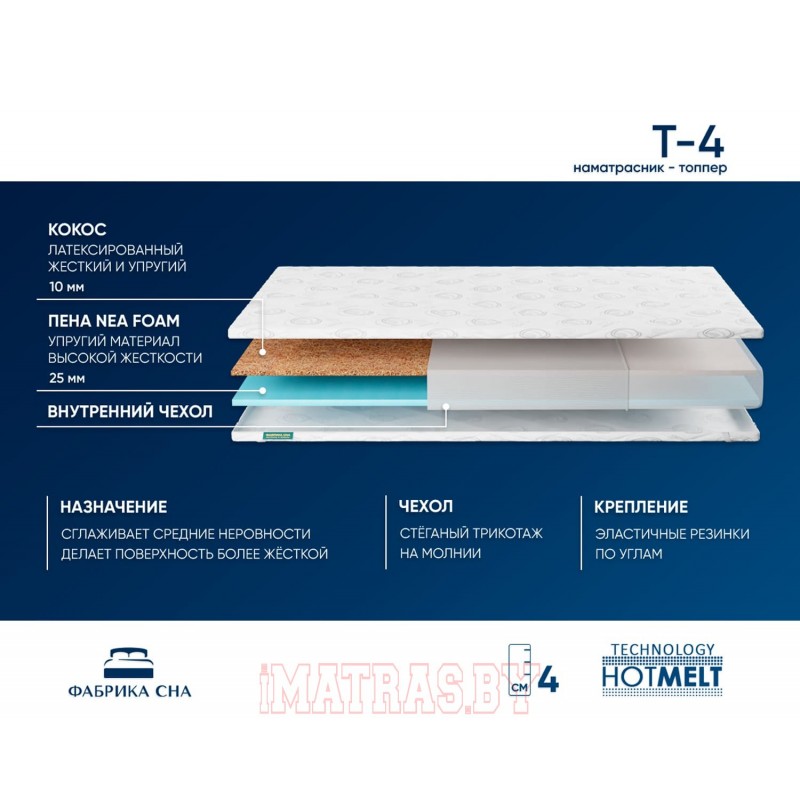 Топпер высотой 4 см с разными сторонами жёсткости. Анатомическая пена Nea Foam обладает высокой эластичностью, хорошей воздухопроницаемостью и гипоаллергенностью, а латексированная кокосовая койра придаёт необходимую жёсткость.