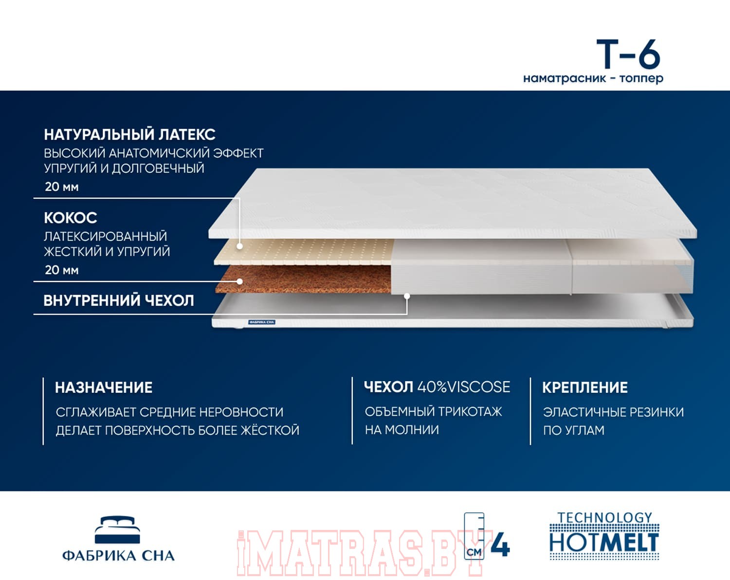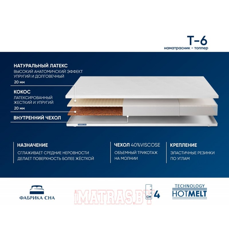 Топпер высотой 4 см с разными сторонами жёсткости. Натуральный латекс обладает мягкостью и упругостью, хорошей воздухопроницаемостью и гипоаллергенностью, а латексированная кокосовая койра придаёт необходимую жёсткость. Повернув модель той, либо иной стороной, можно регулировать степень жёсткости поверхности.
