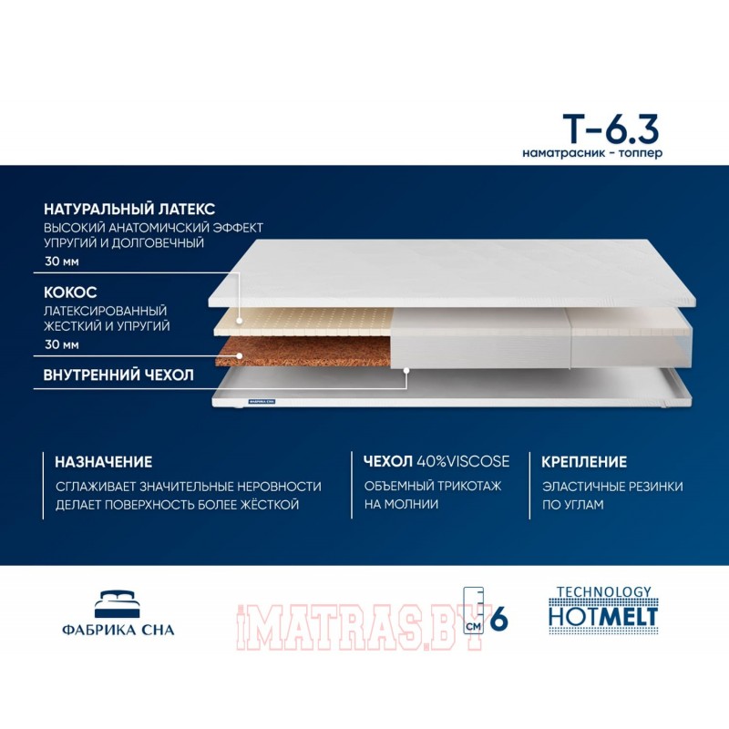 Топпер высотой 6 см с разными сторонами жёсткости. Натуральный латекс обладает мягкостью и упругостью, хорошей воздухопроницаемостью и гипоаллергенностью, а латексированная кокосовая койра придаёт необходимую жёсткость. Повернув модель той, либо иной стороной, можно регулировать степень жёсткости поверхности.